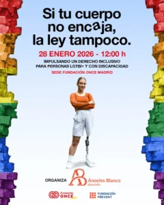 «Si tu cuerpo no encaja, la Ley tampoco» Cuándo enero 28, 2026 12:00 pm - 1:00 pm Añadir al calendario Descargar ICS Google Calendar iCalendar Office 365 Outlook Live Dónde INSCRIPCIONES «Si tu cuerpo no encaja, la Ley tampoco» 28-1 a las 12 hs (Madrid) Sede de Fundación ONCE – Calle Sebastián Herrera, 15, Madrid